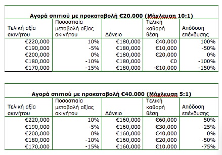 Τι γίνεται όμως αν η αξία του σπιτιού αυξηθεί; Αν το σπίτι πουληθεί μετά από ένα χρόνο €220.000. Οι €180.000 θα χρησιμοποιηθούν για να αποπληρωθεί το δάνειο και στην οικογένεια θα μείνουν €40.000, ποσό διπλάσιο από αυτό που είχε αρχικά επενδύσει. Μια αύξηση λοιπόν 10% στην αξία του σπιτιού οδήγησε στον διπλασιασμό της καθαρής θέσης της οικογένειας.