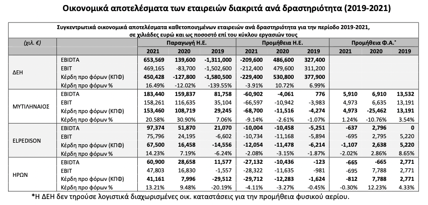 Η ΡΑΕ από την πλευρά της παρέδωσε τους καρπούς της έρευνάς της στον Υπουργό Περιβάλλοντος και Ενέργειας και το κοινοποίησε στην επιτροπή Θεσμών και διαφάνειας της Βουλής στις 06.05.2022. Η ανάλυση της ΡΑΕ είναι αρκετά εκτενής (μπορεί να εντρυφήσει κανείς σε αυτήν εδώ), βασίζεται όμως στα δημοσιευμένα αποτελέσματα χρήσης των εταιρειών ρεύματος, τα οποία σημειωτέων παρουσιάζονται στην έκθεση ως μειωμένα το 2021 σε σχέση με το 2020. Τονίζεται βέβαια ότι η ίδια η αρχή δεν έχει την αρμοδιότητα (ούτε την επιστημονική́ εξειδίκευση) λογιστή́ ώστε να σχολιάσει το ορθό́ και το εύλογο των εγγράφων των οικονομικών καταστάσεων. Η κερδοφορία των συμμετεχόντων στις οικονομικές καταστάσεις επηρεάζεται από́ εγγραφές, όπως το χρηματοοικονομικό́ κόστος, επιμερισθέντα έξοδα Διοίκησης, αποσβέσεις, συναλλαγματικές διάφορες και λοιπά́ έξοδα, τα οποία αποτελούν λογιστική́ αποτύπωση ευρυτέρων επιχειρηματικών αποφάσεων και δεν σχετίζονται άμεσα με το περιθώριο κέρδους στην δραστηριότητα της παραγωγής. Επιπρόσθετα τονίζεται ότι η ΡΑΕ δεν θεωρεί ότι η σύγκριση των οικονομικών καταστάσεων με αυτά́ των προηγουμένων ετών αρκεί για την εξέταση της πιθανής αυξημένης κερδοφορίας κατά́ την περίοδο της ενεργειακής κρίσης, καθώς οι οικονομικές καταστάσεις αφορούν όλο το έτος 2021 και όχι την υπό εξέταση περίοδο της ενεργειακής κρίσης (Οκτώβριος 2021-Μάρτιος 2022) και όπως προαναφέρθηκε, περιλαμβάνουν χρεοπιστώσεις που δεν σχετίζονται άμεσα με τη συμμετοχή́ των εταιρειών στην χονδρεμπορική αγορά.
